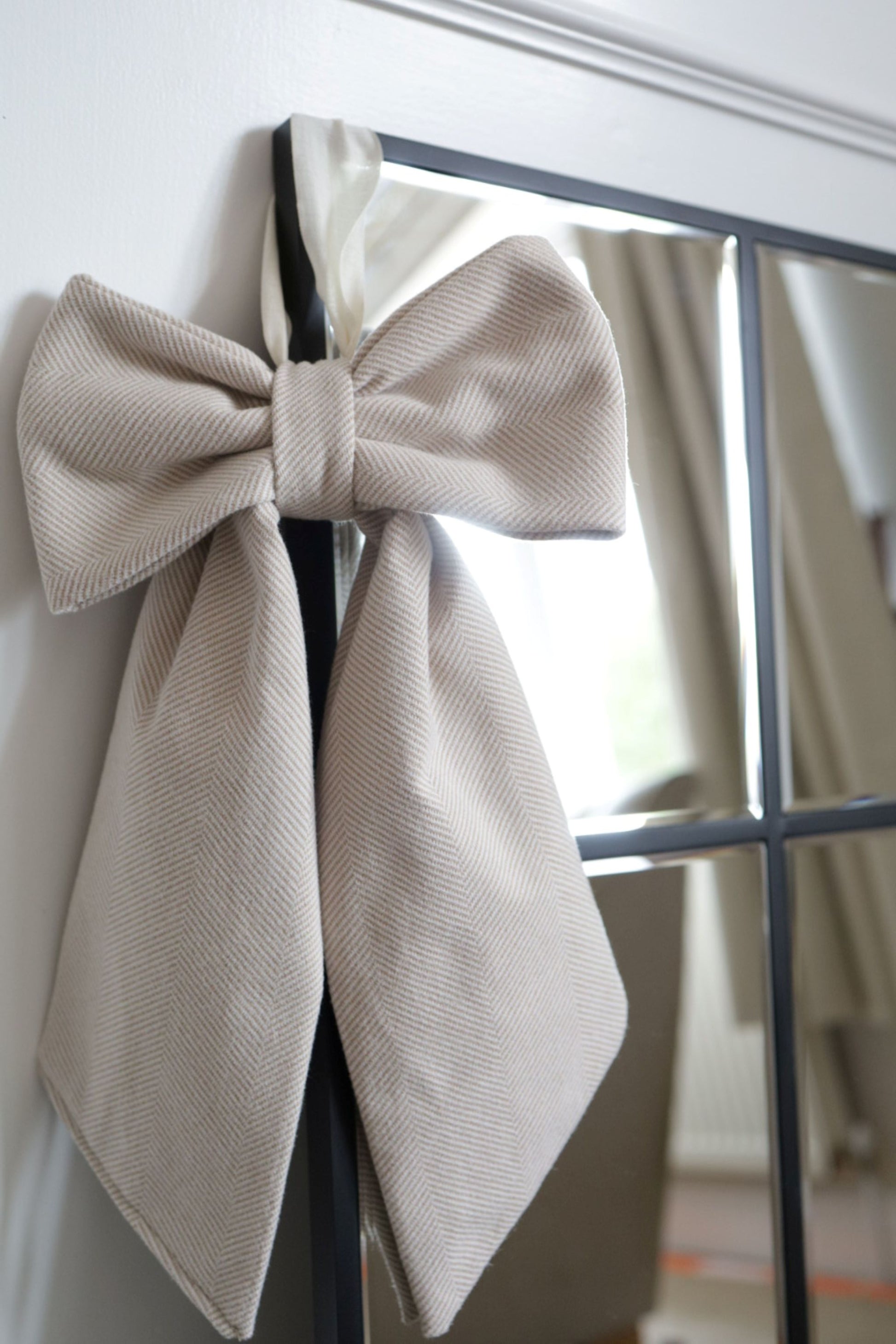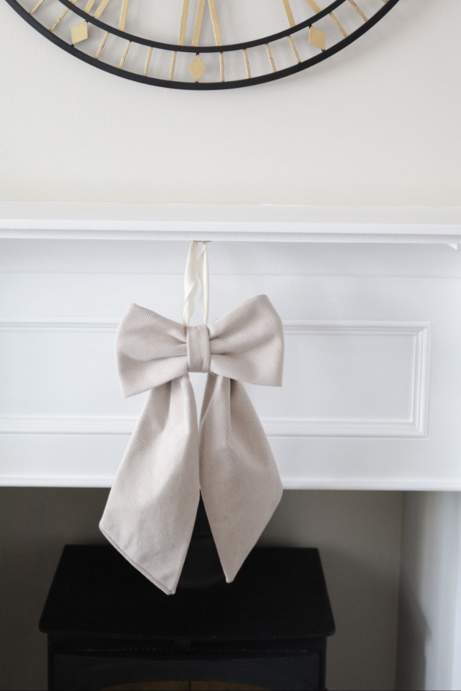 Add a touch of timeless charm to your decor with our soft herringbone bows. Crafted by hand from a soft high quality herringbone fabric. These bows bring an elegant yet cozy aesthetic to any space. Perfect for adorning doors, fireplaces, wreaths or nursery decor. It's subtle texture and gentle hue create a refined, welcoming accent. We have added a hand tied ribbon for easy hanging.